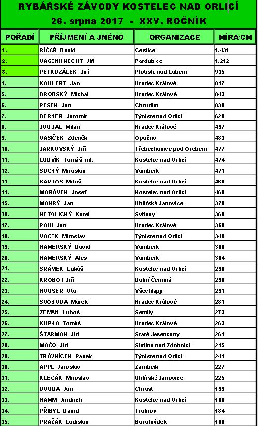 Se závody v sobotu jsem byl velice spokojený. Voda úplně ideální nebyly hlavně z důvodů spadlých větví a stromů. Jinak si myslím, že ryb se nachytalo docela dost. Byl jsem u Vás poprvé, ale určitě se vrátím příští rok znovu. Dobrá atmosféra a perfektní zázemí závodu mně inspirovalo k napsání článku do novin - Orlického deníku. přislíbila mi zveřejnění redaktorka paní Pokorná. V další etapě bych napsal článek do Rybářství. Chtěl bych si nafotit i rybáře při lovu - při závodech jsem to nestihl. Je možné zakoupit si hostovačku, abych si přijel i zatrénovat? Děkuji. S pozdravem Petru zdar Karel… Napsal(a) karel Netolický v pondělí, 28 srpen 2017 12:21 Otevřené rybářské závody 2019 (Sportovní činnost) -